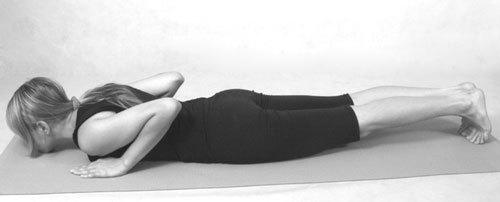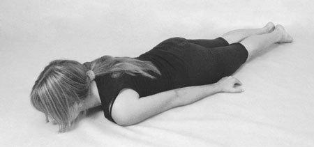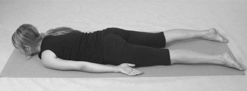 1. Лечь на живот лицом вниз, руки расположить вдоль тела, ноги вместе. Ступни и ладони должны быть направлены вверх.