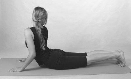 5. Опираясь на руки, медленно повернуть голову, а затем туловище влево, стараясь через правое плечо увидеть пятку левой ноги. Следить, чтобы бедро не отрывалось от пола.