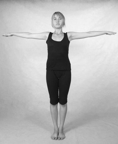 2. Поднять руки на уровень плеч и развести их в стороны, при этом ладони должны быть направлены вниз.