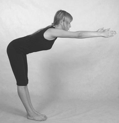 4. Наклониться вперед под углом 90°, потянувшись руками вперед (ладони должны быть направлены друг к другу), живот втянуть.