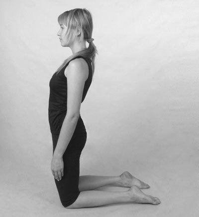 1. Встать на колени – ноги разведены на ширину плеч, руки вдоль туловища, ладони прижаты к бедрам, спина и шея прямые.