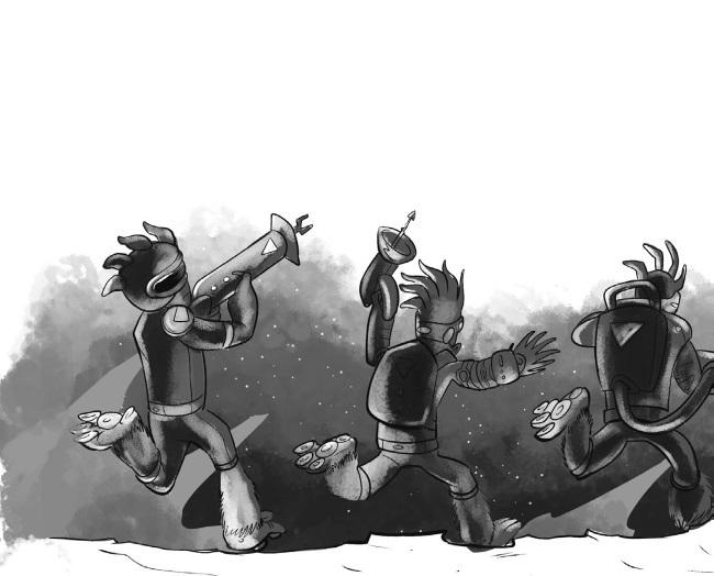 Я слышал выдохи, вырывающиеся из моего третьего лёгкого, того самого, что переходит на ускоренный режим, когда мне страшно. Покрывающая планету красная пыль залепила мои глаза – все шесть. Но у меня совсем не было времени открутить их и замочить в растворе из перебродивших лапок жуков, что является (я уверен, вам это отлично известно) единственным способом очистить сетчатку глаза от межгалактической пыли. Эскадрилья следовала за мной по пятам. Я уже чувствовал жар их лазерных лучей, когда они попадали в присоски, покрывающие мои ступни.