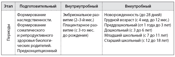 Самыми отличающимися являются три: подготовительный этап, внутриутробное развитие и постнатальное, или собственно детство (см. табл. 1.2).