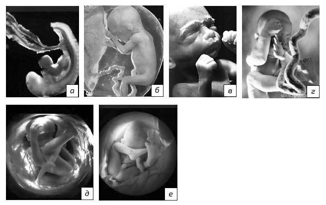 Рис. 1.3. 4-я неделя: дробление зиготы, имплантация, образование зародыша, зачатков важнейших органов и зародышевых оболочек; на 3-4-й неделе начинает биться сердце; на 6-й неделе плод двигает головкой, в б недель движется всем телом (а);