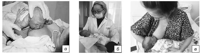 Рис. 1.12. Новорожденный: первое прикладывание к груди (а); партнерские роды (б); пребывание в палате «Мать и дитя» (в)