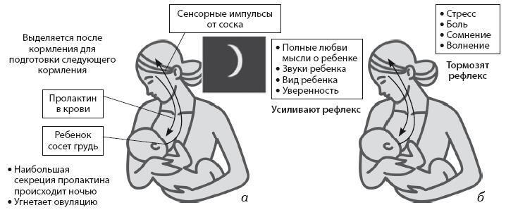 Секреция молока происходит эпителиальными клетками ацинуса, благодаря опорожнению альвеол и переходу секрета в млечные ходы. Раздражение соска при сосании усиливает образование пролактина в гипоталамусе (под влиянием безусловного рефлекса) – рис. 1.14а.