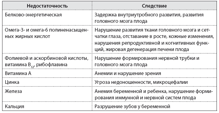 Таблица 1.6. Влияние недостаточности ингредиентов пищи для плода и беременной женщины