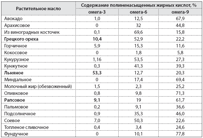 Полужирным выделены растительные масла с максимальным содержанием омега-3-ненасыщенных жирных кислот.