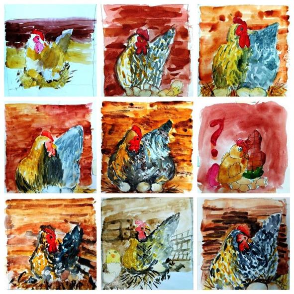 Рис. 1. Наша главная героиня крица Тося в гнезде. Рисунки ребят изостудии «Акварельный мир»