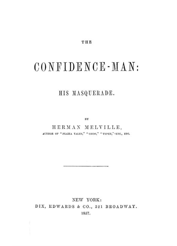 В первый же момент своего появления он ступил на борт парохода «Фидель», первого из отправлявшихся в Новый Орлеан. Пристально разглядываемый, но не приветствуемый, в атмосфере отчуждения, не избегая взглядов, но равномерно следуя намеченному пути, проведшему его через пустыни или города, он шёл по нижней палубе, пока случайно не подошёл к плакату, наклеенному рядом с конторой капитана и предлагавшему вознаграждение за поимку таинственного самозванца, который, как предполагали, недавно прибыл с Востока, — совершенно оригинального гения в своём призвании, как будто бы только что появившегося, хотя, в чём состояла его новизна, ясно не было, но она подразумевалась согласно следующему тщательному описанию его личности. Словно возле театральной афиши, толпа собралась вокруг этого объявления, и среди неё некоторые кавалеры, чьи глаза, словно оно было равниной, в основном или, по крайней мере, искренне пытались разглядеть его через одежду пришедших людей; но что касается ловких кавалеров, то они были заняты неким делом, поскольку во время случайной паузы один из них жестом выказал желание купить у другого, по профессии продавца денежных поясов, одно из его популярных изделий, в то время как другой коробейник, который оказался весьма разносторонним кавалером, распродавал в гуще толпы жизнеописание Мисана, бандита из Огайо, Марелла, пирата Миссисипи, и братьев Харп, головорезов из страны Грин-Ривер в Кентукки, — существ уже иного вида, всех до единого истреблённых в своё время, как в большинстве случаев охотниками истребляются целые поколения волков в некоторых местностях при оставлении небольшого количества их преемников, что, как считается, является причиной для чистосердечного поздравления всем людям, кроме тех, кто думает, что в новых странах, где уничтожаются волки, увеличивается поголовье лис.