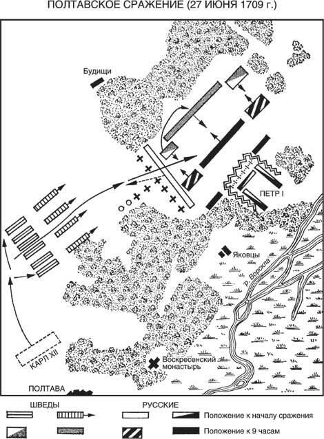 В 9 часов шведы начинают атаку. Русские идут им навстречу. Начинается рукопашная схватка, которая решит судьбу двух стран. Правый фланг шведов, куда приказал отнести себя Карл, воодушевленный присутствием короля, врубается в первую линию русских. Петр бросается туда во главе одного батальона. Со всех сторон свистят пули. Одна пробивает треуголку Петра, вторая застревает в седле его коня, наконец, третья попадает в большой крест у него на груди. Карл тоже рискует собой. Из окружавших его 24 гвардейцев в живых остаются всего три. Но вмешательство царя оказывается решающим, шведы опрокинуты. В носилки Карла попадает ядро, король падает на землю и теряет сознание. Весть о его гибели с молниеносной быстротой разносится по его армии. И вдруг шведы начинают откатываться назад. Напрасно очнувшийся Карл XII кричит: «Шведы! Шведы!», исход битвы решен. Русская кавалерия преследует и рубит бегущих. Полная победа. На поле битвы остаются 9000 убитых и раненых шведов, 2700 попали в плен, в их числе первый министр короля Пипер и фельдмаршал Реншильд. Русские потеряли 1345 человек убитыми и 3290 ранеными. Вечером этого знаменательного дня Петр устраивает пир для пленных шведских генералов. Он провозглашает тост: «За наших учителей в военном искусстве!» – «Кто же эти учителя?» – осведомляется Реншильд. «Вы, господа шведы». – «В таком случае, ваше величество, вы их достойно отблагодарили!»