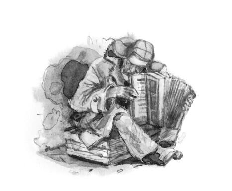 У самого выхода, на ящике из-под атлантической сельди, сидел человек в грязном тулупчике и костистыми пальцами жал на клавиши и кнопки своей двухголосной гармоники. Глаза человека были закрыты. Лука приостановился.