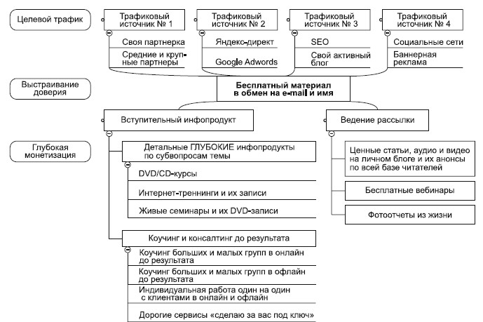 Вообще лучше делать все возможное для привлечения трафика. Естественно, мы исключаем нелегальные методы типа спам-рассылок и т. п. Желательно использовать все источники – партнерскую программу, Яндекс. Директ, блогинг, социальные сети, баннерную рекламу, – чтобы ваша подписная база росла, вы могли общаться со своими потенциальными клиентами, выстраивать с ними доверительные отношения, делать первые продажи.
