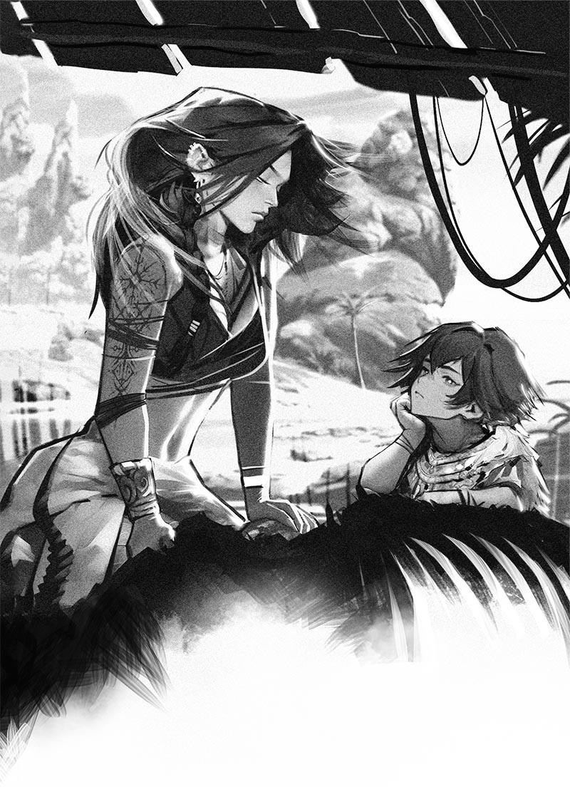 Шкура у входа снова заколыхалась, выпуская из хижины Донги, самую старшую женщину клана. Ее когда-то густые волосы поредели и утратили цвет, кожа одрябла и выглядела чужой, будто не кожа, а одежда, татуировки казались грязными разводами, но взгляд раскосых темных глаз до сих пор оставался пронзительным. Донги остановилась у входа, сложив тонкие руки на животе, отчего браслеты на запястьях глухо стукнули друг о друга. Она смотрела на Арнара с Рабашем и словно не решалась подойти к ним.