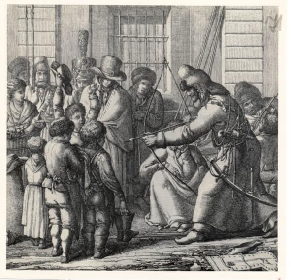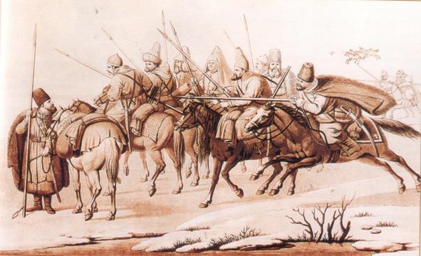 На прижизненной картине художника Хюбейля К. Л. «Башкиры в Берлине» изображен башкирский воин, одетый в национальную одежду, вооруженный луком, стрелой, саблей и пистолетом. Он показывает детям Берлина, как стрелять из лука[28]. Очень ловко и удобно пристроен пистолет в кочевнической кобуре. Удивительно смелы и решительны были наши предки, раз брались захватывать даже столицы — Кенигсберг, Варшаву, Берлин, силами только легких отрядов и авангардов! Из письма Б.-Г. Нибура о башкирах в Берлине: «Март 1813 года. Для детей началась прекрасная пора; казаки балагурят с ними и возят их верхом на лошадях. Прибыли также калмыки и башкиры, однако их осталось здесь немного. Сами казаки показывают их как необыкновенное зрелище»[29].