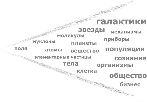 Традиционно схема науки представляется в виде расходящегося луча, острие которого находится где-то в нижнем конце оси, по которой можно выстроить все объекты нашего мира по их сложности — от мельчайших частиц до галактик, живой природы, сознания… и куда-то далее.