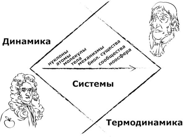 Луч законов Термодинамики направлен со стороны высших систем природы навстречу лучу законов Динамики. В районе систем, на которые человек испокон века смотрит, как на объекты своих воздействий, расположены три основных постулата, которые физики назвали Началами термодинамики. Ближе к острию луча, то есть там, где расположены системы, над которыми человек уже не властен так, как над газом или жидкостью в сосуде, как минимум потому, что сам является их частицей — это биологические или социальные объекты, расположены закономерности неравновесных систем. А в самом острие второго луча можно предположить существование еще не открытых фундаментальных законов, которые должны объединять все вложенные друг в друга системы. Возможно, например, там существует некий Закон баланса, который свяжет явление глобального расширения и остывания Вселенной с появлением в ее локальных частях все более «горячего» — упорядоченного, высокоорганизованного движения материи. Однако такие закономерности мог бы разглядеть лишь тот, кто находится в самом острие луча — кто на все сущее в любой его сложности может смотреть сверху вниз, кто выше всего — то есть Всевышний. Науке до таких высот еще очень далеко. Даже существование инопланетных форм жизни до сих пор является лишь гипотезой.