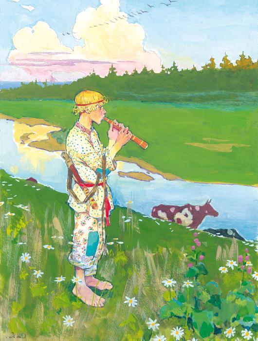 Спино́й к па́рню, а по косе́ вида́ть – де́вка. Коса́ сси́за-чёрная и не как у на́ших де́вок болта́ется, а ро́вно прили́пла к спине́. На конце́ ле́нты не то кра́сные, не то зелёные. Сквозь свете́ют и то́нко э́так позва́нивают, бу́дто листова́я медь. Диви́тся па́рень на ко́су, а сам да́льше примеча́ет. Де́вка небольшо́го ро́сту, из себя́ ла́дная и уж т