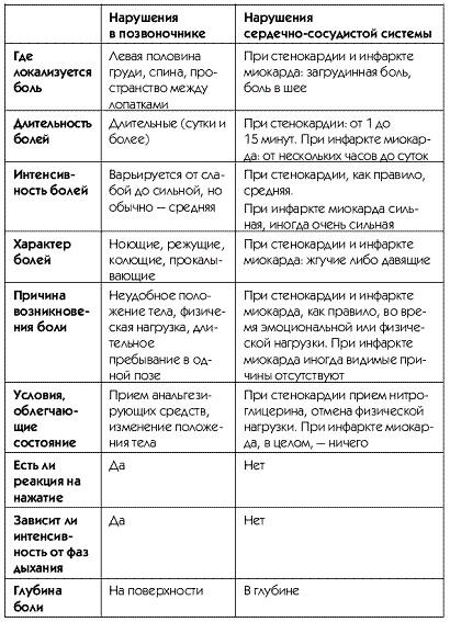 Опытный врач уже после опрашивания больного может определить происхождение болевого синдрома и неприятных ощущений в груди: связаны ли они с болезнями сердечно-сосудистой системы или с нарушениями в позвоночнике. Кроме того, не следует забывать о том, что инфаркт также проявляется болями в груди. В сравнительной схеме, которую я привожу в виде таблицы (табл. 1), вы можете увидеть сравнительные различия болевого синдрома в груди при нарушениях в позвоночнике и болезнях сердечно-сосудистой системы.