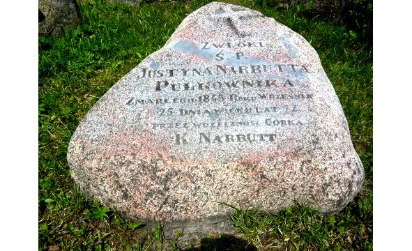 ZWŁOKI / S. P. / JUSTYNA NARBUTTA / PUŁKOWNIKA / ZMARŁEGO 1845 ROKU WRZEŚNIA/ 25 DNIA WIEKU LAT 72 / PRZEZ WDZIĘCZNOŚĆ CÓRKA / K. NARBUTTA //.