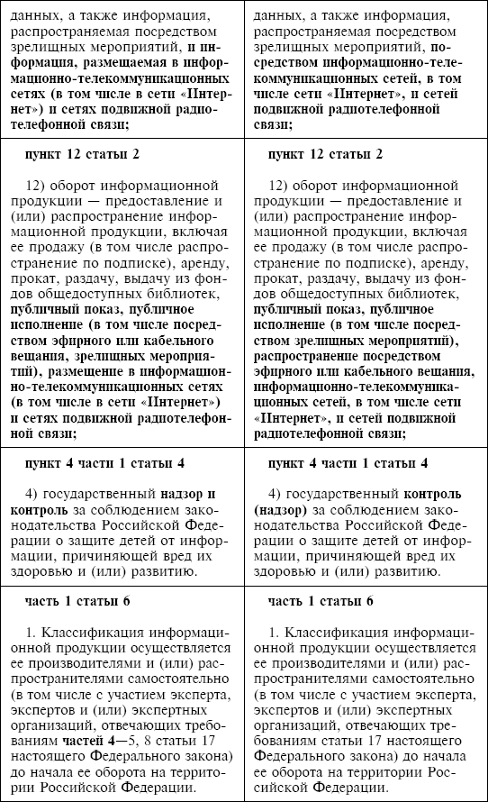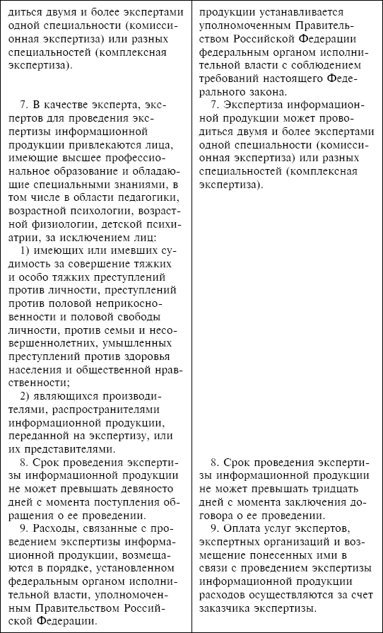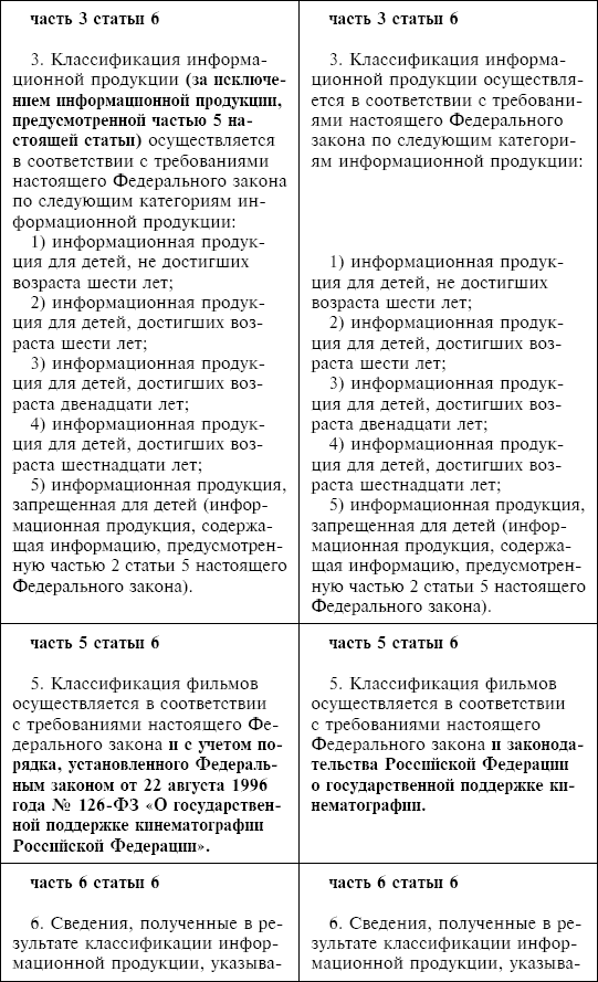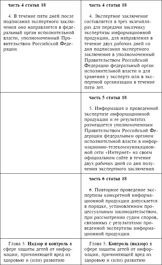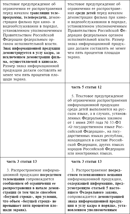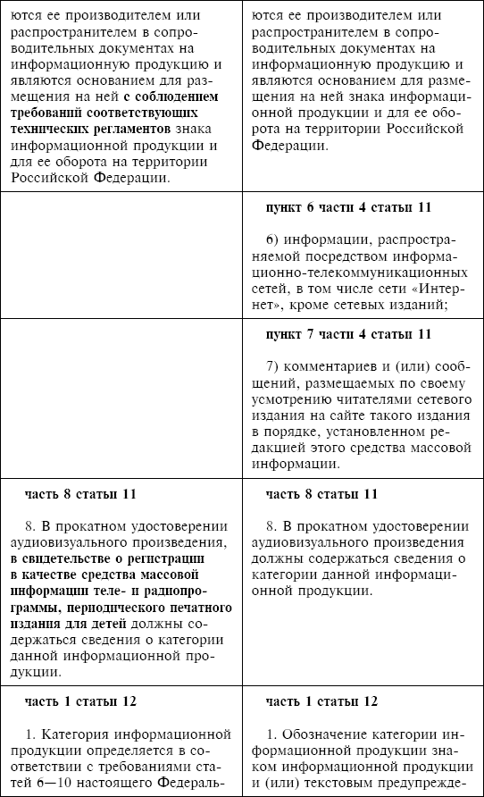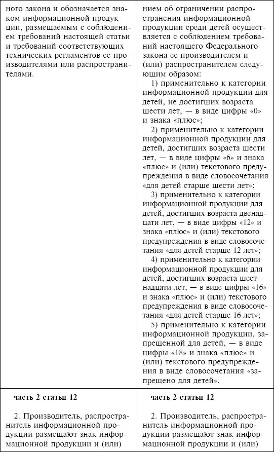 Скорректированы требования по защите детей от вредной информации. В частности, вводятся единые знаки информационной продукции для детей. В графическом формате ее обозначают так: для детей до 6 лет – 0+; достигших 6 лет – 6+; 12 лет – 12+; 16 лет – 16+; запрещенной для детей – 18+. Вместо этого может использоваться соответствующее текстовое предупреждение («для детей старше 6, 12 или 16 лет», «запрещено для детей»). При кино– и видеообслуживании такой знак помещается перед началом показа фильма. Его размер – не менее 5 % площади экрана. На телевидении он должен транслироваться в углу кадра в начале программы (передачи) и после каждого перерыва на рекламу. В начале каждой радиопередачи (кроме идущих в прямом эфире) также обязательно сообщается об ограничении распространения информации среди детей. При анонсировании программ, запрещенных для детей, нельзя использовать фрагменты с вредной для детей информацией. Предупреждающий знак обязателен для интернет-СМИ. Исключение – размещение читателями комментариев и сообщений на сайте издания. Иные сайты могут содержать такой знак. Классификация сайтов проводится их владельцами самостоятельно. Уточнен порядок проведения экспертизы информационной продукции. В частности, сведения из реестра аккредитованных экспертов (экспертных организаций) и результаты проведенной экспертизы размещаются в Интернете.