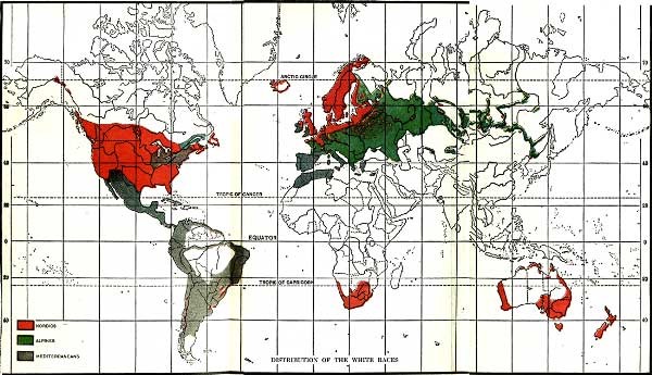 The second phenomenon is of equal importance, namely, the more or less thorough Nordicizing of the westernmost extensions of the other two races, namely, the Mediterranean on the north coast of the Inland Sea, who have been completely Aryanized in speech, and have been again and again saturated with Nordic blood, and the even more profound Nordicization in speech and in blood of the short, dark, round-skulled inhabitants of central Europe, from Brittany through central France, southern Germany, and northern Italy into Austrian and Balkan lands. So thorough has been this process that the western Alpines have at the present time no separate race consciousness and are to be considered as wholly European.