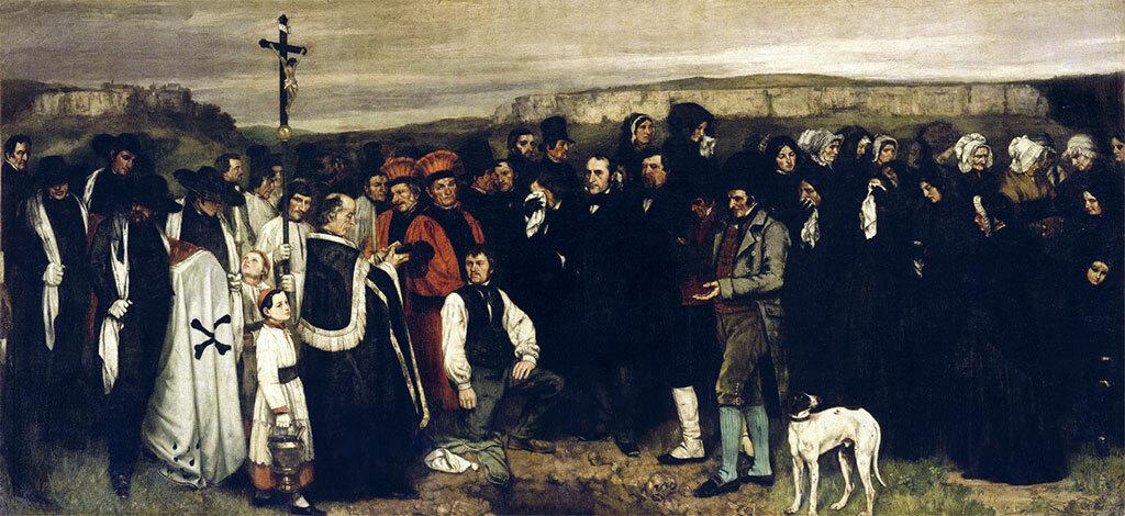 Обыденную реальность сделали предметом изображения и другие французские реалисты, среди которых Гюстав Курбе, Жан-Франсуа Милле, Оноре Домье. Они писали некрасивые стороны жизни: бедность, печальную старость, пьянство – то есть многое, что не вызывает эстетического восторга. Одной из самых показательных картин стала работа «Похороны в Орнане» Гюстава Курбе. Это картина огромного формата, на которой изображены похороны жителя маленького городка на востоке Франции – грустное и ординарное событие, написанное тёмными красками. Художник правдиво передаёт внешность немолодых и некрасивых людей: красные носы пьющих священников, заплаканные лица женщин, – а на передний план помещает зияющую дыру могилы. По академическим законам на полотнах такого масштаба могли изображаться только великие исторические события и уж точно не унылые провинциальные сцены. Курбе также не стал прописывать детали картины тонко и филигранно. Таким образом, он сильно вышел за рамки – и форматом, и сюжетом, и изобразительной манерой.