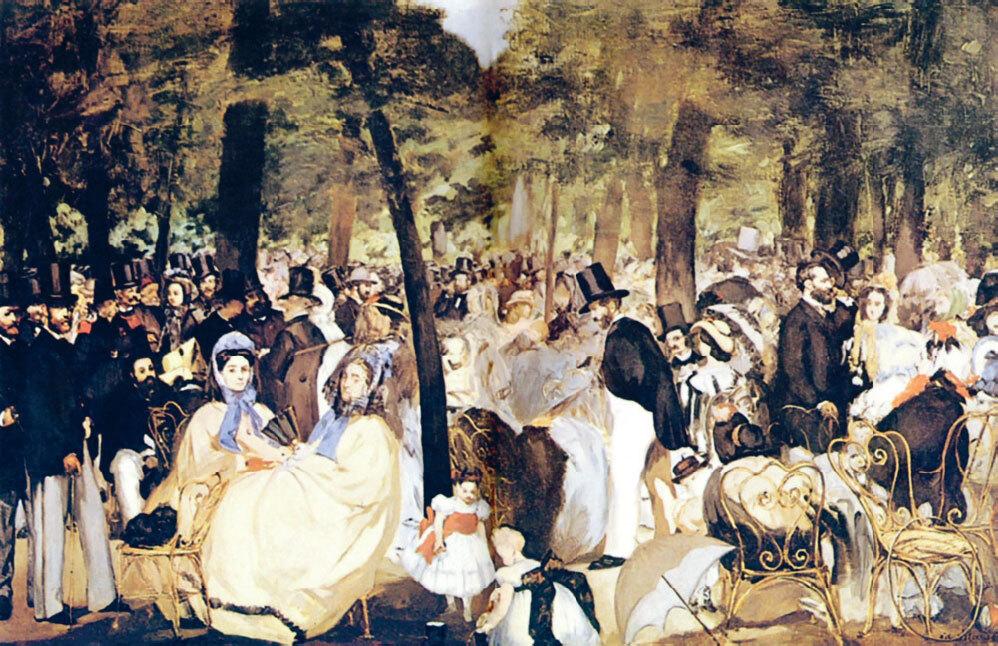 Ещё сильнее позволил себе выйти за рамки Эдуар Мане. Именно за этим мастером пойдут импрессионисты, вдохновившись его идеями и приёмами. В 1862 году он написал большую картину «Музыка в Тюильри». Французское общество расположилось для отдыха в саду неподалёку от Лувра, где каждую неделю проходили музыкальные концерты. Праздник, отдых на природе – очень популярная во французском искусстве тема, любимая и в XVIII, и в XIX веке.