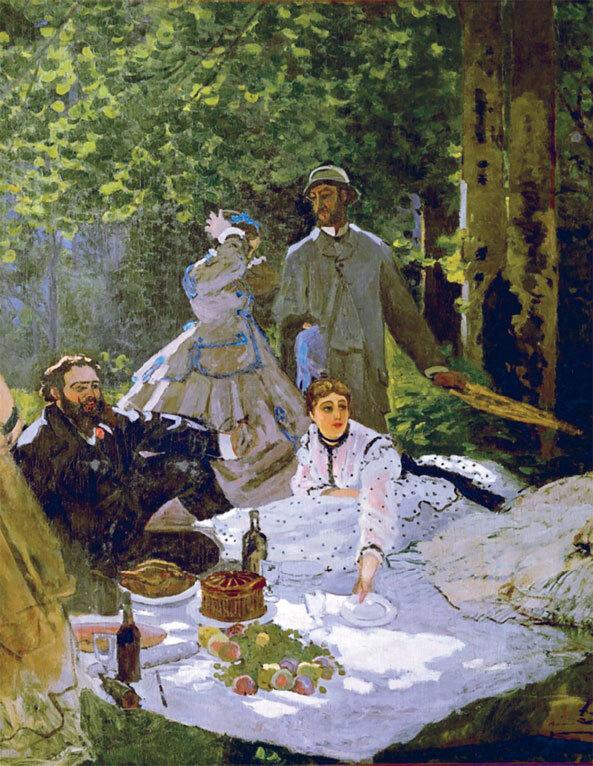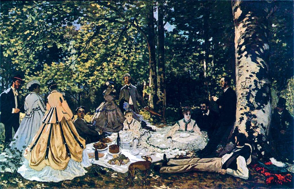 Клод Моне, в будущем самый известный из импрессионистов, продолжил писать сюжеты про отдых на природе. В «Завтраке на траве» перед нами снова отдыхающие в тени деревьев французы. На первый взгляд художник довольно консервативно соблюдает академические установки и располагает фигуры на первом плане, а композиция разворачивается по горизонтали. Кроме того, рассадив героев вокруг расстеленной на лужайке скатерти, художник вписал их в фигуру эллипса, усилив ощущение порядка и равновесия композиции. Однако, присмотревшись к героям получше, мы понимаем, как далёк Моне от академизма. Все персонажи ведут себя непринуждённо, они общаются. Стоящая в центре дама поправляет шляпку, отдав спутнику зонт и шейный платок. Сидящая перед ними женщина протягивает руку к тарелке, при этом внимательно смотрит на отдыхающего под деревом господина. Дамы слева ведут разговор между собой, а стоящая ближе всего к переднему краю картины собачка внезапно обернулась на них.