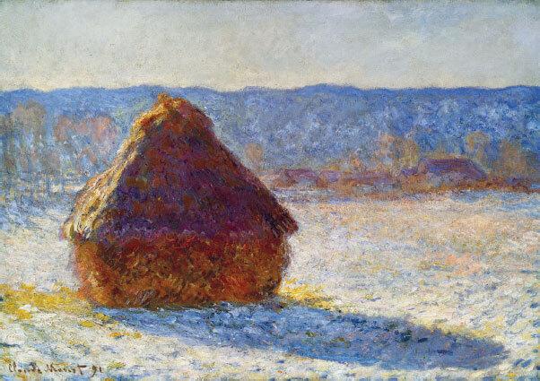 На другой картине преобладают холодные оттенки: голубой цвет тени на снегу и сиреневый оттенок заснеженного луга контрастируют с мазками цвета золотистой охры, которыми написана нижняя часть стога, и прохладными оттенками фиолетового на верхней части стога. Художник продолжает сочетать контрасты для яркости, причём лежащие рядом мазки контрастных цветов едва различимы – нужно рассматривать картину с близкого расстояния, чтобы это заметить.