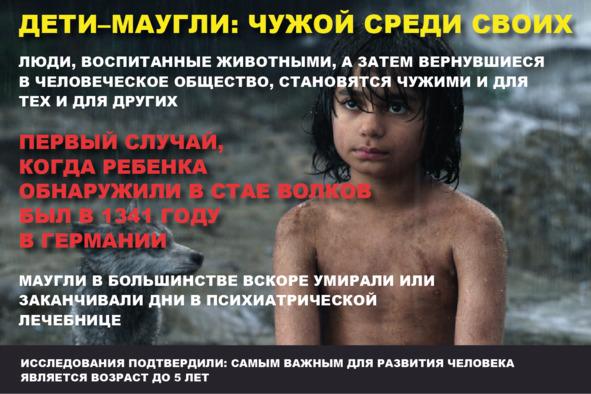 История настоящих маугли — это человеческая трагедия, далекая от романтизма человеческого детеныша Киплинга. Люди, воспитанные животными, а затем вернувшиеся в человеческое общество, становятся чужими и для тех и для других.