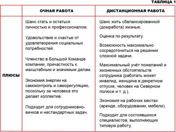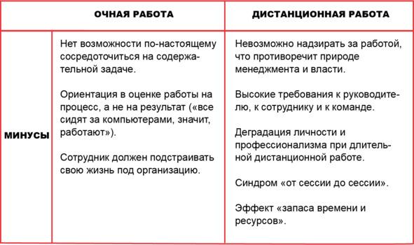 Продолжая сравнивать дистанционную работу с очной, мы составили таблицу из плюсов и минусов для человека и организации.