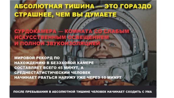О своем пребывании в сурдокамере спустя годы вспоминают в мельчайших подробностях многие космонавты. И это понятно: эмоций там хватало через край. Случались и галлюцинации. Например, одному казалось, что стены смыкаются и размыкаются перед его глазами, другой отчетливо увидел… стаю белок, марширующих по снежному полю с мешками через плечо, третий слышал музыку Баха и Бетховена… Валерий Быковский, первым прошедший испытания одиночеством в сурдокамере 6 апреля 1960 года, успокаивал сослуживцев: «Ничего особенного». Но Павел Попович потом признался: «Нелегко». Андриян Николаев вспоминал: «Хотелось услышать хотя бы тонюсенький птичий писк, увидеть что-нибудь живое. И вдруг меня словно кто-то в спину толкнул. Поворачиваюсь — и в малюсеньком обзорном кружочке вижу глаз. Живой человеческий глаз. Он сразу исчез, но я его запомнил: от табачного цвета глаза до каждого волоска рыжеватых ресниц…». Нечто подобное испытал Борис Волынов: «Живое слово, только одно слово — что бы я отдал тогда за него!»[2]