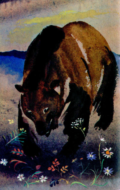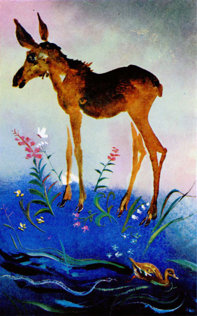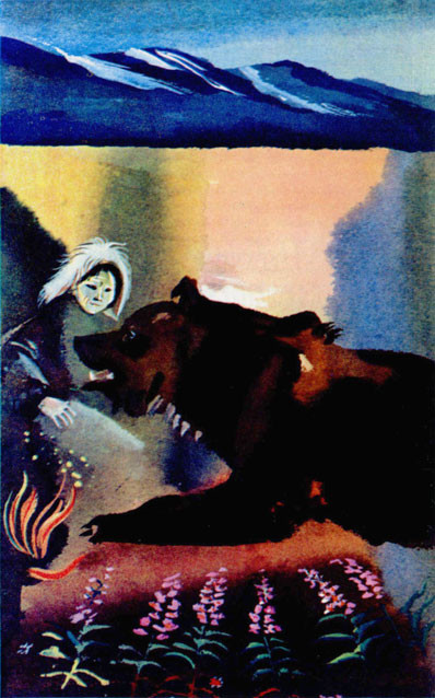 Девочка пошла к зверям. Звери ее полюбили. Белка носила ей орешки, медведь приносил ягоды. Девочка днем качалась на рогах сохатого, греясь на солнышке (его рога летом пушисты и мягки). Зимой девочка жила в берлоге медведя. Лисичка приходила в берлогу, и все звери навещали девочку, потому что тогда звери жили дружно. У них был общий язык.