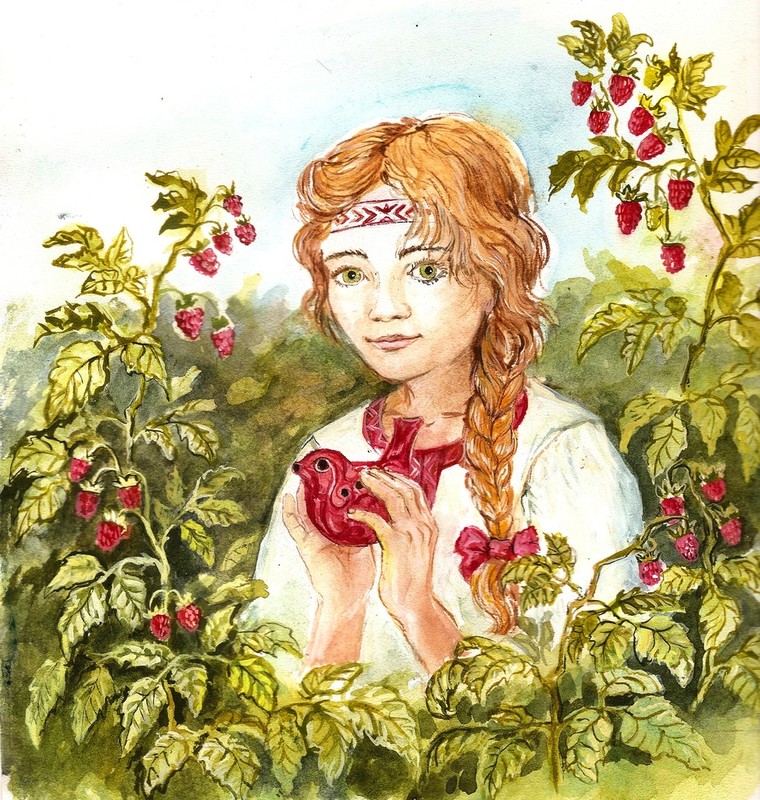 «Может, это птичка поёт?», — думала Бэлла, следуя за мелодией. Она протиснулась сквозь густые заросли дикой вишни и чуть не подпрыгнула от удивления. В самом центре круглой поляны на стволе поваленного дерева сидела ещё одна девочка и, перебирая пальцами у рта, играла на каком-то странном музыкальном инструменте. Заметив Бэллу, она приветливо ей помахала.