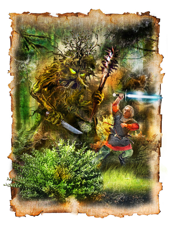 Вскоре молодец добрался до входа в пещеру и тут вдруг почувствовал, что он не один. Справа от него раздался громкий треск. Кузнец резко повернул голову и остолбенел. В нескольких шагах от него стояло чудовище похожее на огромный кряжистый24 пень, выкорчеванный из земли вместе с корнями. Вот на этих-то самых корнях оно и стояло. Вместо рук — толстые длинные ветви. Вместо носа –крючковатый сук. Рот как огромное дупло. Вот только глаза, явно не соответствовали данному персонажу: живые и подвижные, отливающие изумрудным светом, вовсе не подходящие неотёсанному пню. Именно они-то и придавали ему свирепый вид. Это был тот самый Леший, о котором говорила старуха. А на одном из сучков, выступающих из его, так сказать, головы и чем-то напоминающем ухо, сидел филин. Как показалось молодому человеку, именно этого ночного хищника он и видел на ветке березы, что стояла рядом с избушкой старухи. Пока они разглядывали друг друга, Иван успел опомниться от невольного замешательства. А тут и чудовище заговорило низким, глухим голосом: