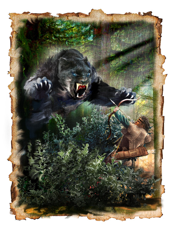 Добравшись до места, они наконец-то смогли рассмотреть своего врага получше. До сих пор было как-то не до этого. На земле лежал огромных размеров хищник. Он был гораздо крупнее, чем показался им, когда они впервые увидели его на расстоянии в сотню аршин. Но немного меньше того, что падал на них сверху. Как им тогда привиделось, он закрыл собою солнце, которое к тому времени уже успело высоко подняться. Всё тело и хвост этого зверюги были покрыты густой длинной шерстью, отливающей темно-болотным цветом. В приоткрытой пасти торчали массивные зубы. Четыре невероятно огромных клыка: два сверху и два снизу, даже у бездыханного зверя, заставляли содрогнуться, вызывая бегущие по коже мурашки. Когти на толстых и мощных лапах мало чем отличались от острых стальных клинков. Его глаза уже не светились холодно-синим светом. На месте одного, куда попала стрела, была лишь запёкшаяся кровь, а другой — помутнел и был полузакрыт.