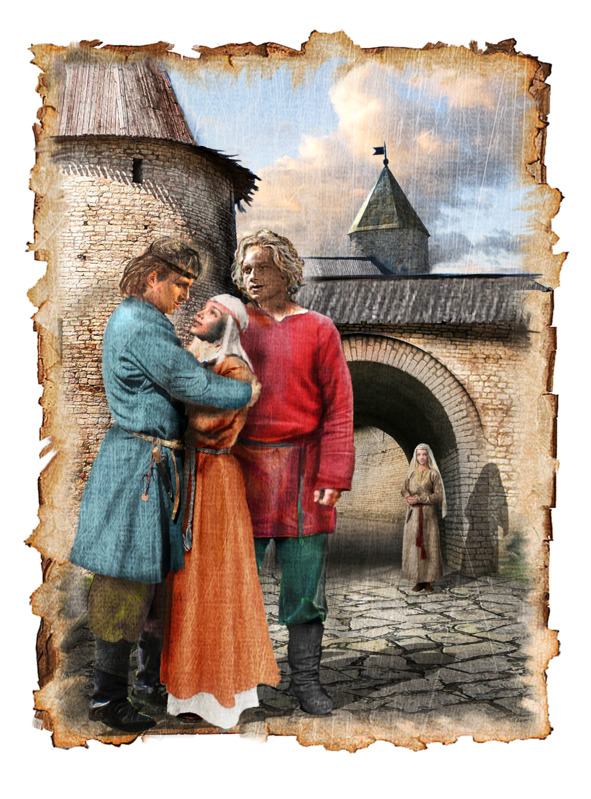 К вечеру второго дня вдали показались два всадника. По мере их приближения всё отчётливее вырисовывался облик людей, дорогих для каждой девицы посвоему. Обе красавицы быстро сбежали вниз по каменным ступенькам и устремились к широким воротам, открывающим доступ в город. Полина же остановилась в их проёме, не желая выказать свои чувства к Ивану. Милана тем временем бежала до тех пор, пока не поравнялась со всадниками. Когда два молодых человека одновременно и ловко спрыгнули с коней, она повисла на их крепких шеях и сильно прижалась к обоим.
