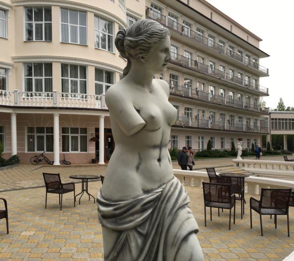 Санаторий — это советский вариант «все включено». Санаторий «Центросоюз» — островок СССР в бушующем мире загнивающего капитализма. На траве таблички «По газонам не ходить, штраф 1000 рублей», у входа античные скульптуры. Все солидно, степенно. Помимо античности есть еще девушки с веслами и с корзинами фруктов. Я хожу весь из себя усталый, много повидавший, с поднятым воротником. Но не потому что такой романтичный, а спасаюсь от ветра с Эльбруса. Меня сразу направили в столовую. В столовой тоже СССР, только вкуснее. Макароны, запеканки, вареники, котлеты. И еще сырки ванильные, глазированные. Меня все это устроило. Главное — присутствовал мой любимый компот из сухофруктов. В столовой разговоры, кого где щипало во время процедур. Мужчин мало, чувствую, что в бой тут идут даже старики.