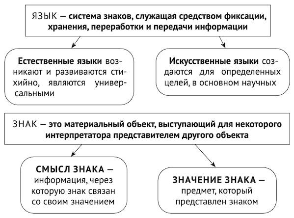 Мышление осуществляется в языке и без языка невозможно. Языком называется система знаков, служащая средством фиксации, хранения, переработки и передачи информации. А знак — это чувственно воспринимаемый предмет, выступающий для некоторого интерпретатора представителем какого-либо объекта, ситуации, любой характеристики предметов, событий, вообще чего угодно. То есть знак представляет все, о чем можно говорить. Предмет, который представлен знаком, называется значением знака. Знак связывается со своим значением посредством информации, иногда заключенной в самом знаке, а чаще приписываемой знаку. Эта информация называется смыслом знака. Именно смысл позволяет связать знак с его значением, иначе говоря, смысл — это то, что понимает человек, употребляющий или воспринимающий знак. Любая система знаков называется языком.