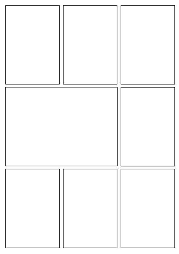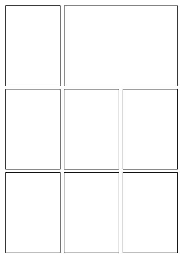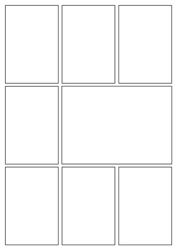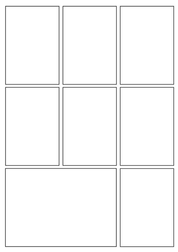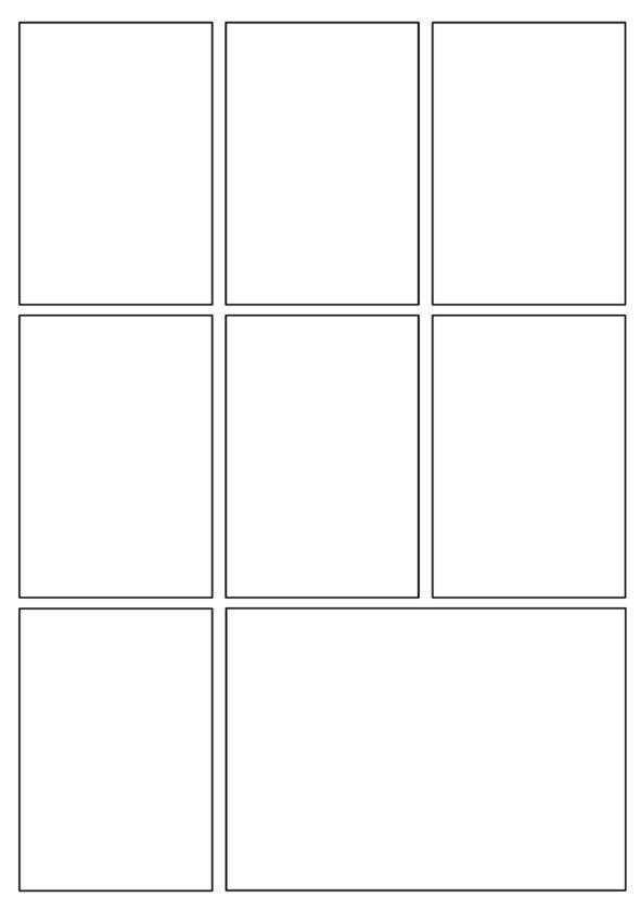 Storyboard pages for a comic book. Collection of page templates for comics with rectangular frames. You don’t have to worry about storyboarding the pages of your future comic book anymore. You can draw it right away. You can use this collection in two ways: 1) buy a paper version and draw with a pencil, and then scan; 2) buy an electronic version, divide it into separate pages and draw in photoshop or other programs.