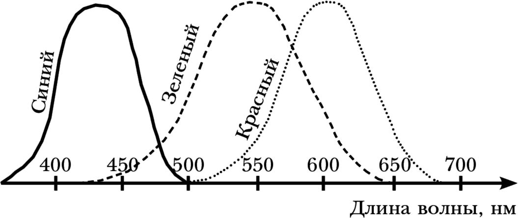 Но, оказывается, человеческий глаз не способен воспринимать все цвета радуги. В глазах человека есть три типа светочувствительных клеток, которые ответственны за восприятие красного, зеленого и синего цветов. Например, лампу синего цвета видят клетки, которые воспринимают синий цвет. Но что делать с промежуточными цветами, например, с голубым? Оказывается, светочувствительные клетки восприимчивы к некоему диапазону вокруг их основного цвета. Соответственно, когда мы видим, например, предмет голубого цвета, работают как зеленые, так и синие клетки. Они передают эту информацию мозгу, и он понимает, что это что-то промежуточное между зеленым и синим.