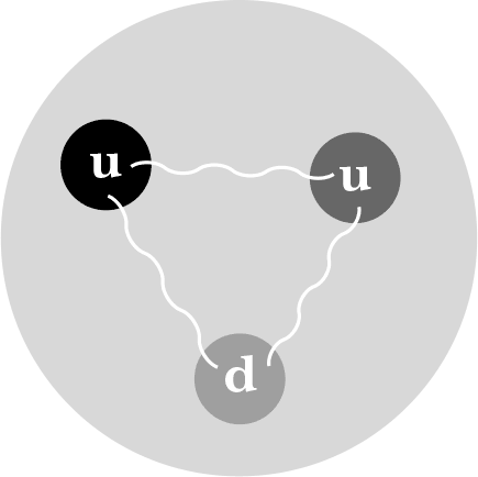 Осталось рассмотреть только ядро: что происходит внутри него? Ядро состоит из протонов и нейтронов, а вот они, в свою очередь, состоят из кварков. Несмотря на то, что эти частицы очень-очень маленькие, между ними действует колоссальная сила в 150 000 Ньютонов. Это вес 15-тонного груза. Нет, вы только представьте: на 1 протон можно повесить 15 тонн! Но самое необычное вот в чем. Если мы захотим разорвать протон, возьмемся за два кварка и начнем их растягивать, то сила притяжения между ними будет только увеличиваться. Между кварками существует некая струна, которая в какой-то момент разрывается, и из пространства образуются еще два кварка, которые притягиваются к тем, которые у нас в руках. В итоге в одной руке у нас останется протон, а в другой руке будет мезон. Но как бы мы ни старались, у нас не получится сделать так, чтобы в руке остался только один кварк. Это явление называется конфайнмент. Оно означает, что кварки заперты в своих частицах и их вообще никак невозможно разделить.