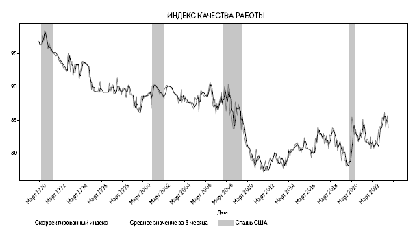 1) Индекс качества рабочих мест, описывающий соотношение рабочих мест с высоким и низким уровнем оплаты в США, снижался на протяжении последних 30 лет. По состоянию на январь 2024 года индекс качества рабочих мест в США был около 83, в то время как еще в начале 1990-х годов он был выше 95 пунктов.