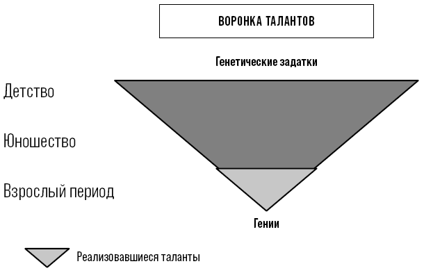 Этот процесс (генов, воздействия внешней среды и накапливания решений, которые вместе определяют возможность реализации таланта) удобно представить в виде Воронки талантов. Когда человек рождается, у него может быть набор генов, которые дают потенциал для развития таланта в той или иной области. Однако по мере взросления факторы окружающей среды или собственные решения могут привести к тому, что талант так и не будет реализован – или, наоборот, воплотится в полной мере.