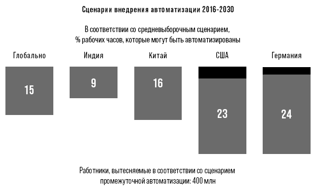 На глобальном уровне также прогнозируется дисбаланс между потребностью в креативных и высокообразованных специалистах и резким сокращением спроса в сфере производства и рутинной офисной работы. Так, согласно прогнозу McKinsey, к 2030 году до 400 млн людей во всем мире могут лишиться работы из-за автоматизации. А в целом при существующем уровне развития технологий до 50% рабочих мест потенциально могут быть заменены ИИ и роботами[6].
