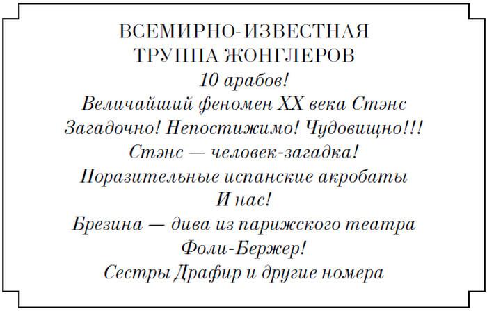 Отчаянный пляс и обворожительные улыбки трио Драфир не произвели никакого действия на передовые круги старгородского общества. Круги эти, представленные в кафешантане гласным городской думы Чарушниковым с двоюродной сестрой, первогильдейным купцом Ангеловым, сидевшим навеселе с двумя двоюродными сестрами в палевых одеждах, архитектором управы, городским врачом, тремя помещиками и многими менее именитыми людьми с двоюродными сестрами и без них, проводили трио Драфир похоронными хлопками и снова предались радостям «семейного парадного ужина с шампанским Мумм (зеленая лента) по два рубля с персоны».