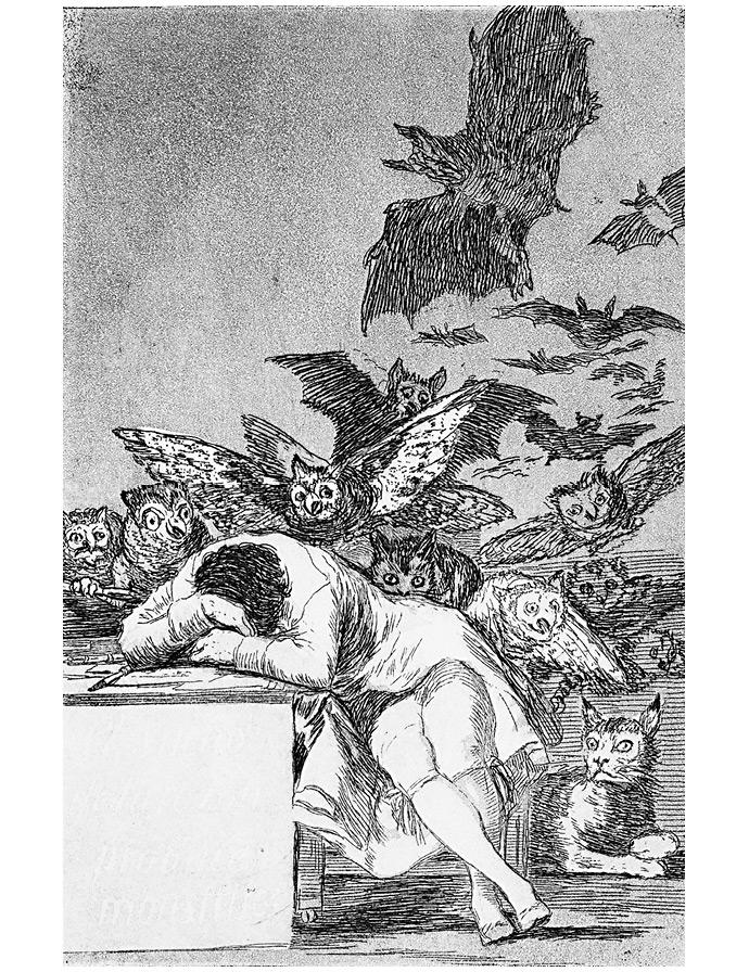 Гойя сопроводил изображение следующим пояснением: «Когда разум спит, фантазия в сонных грезах порождает чудовищ, но в сочетании с разумом фантазия становится матерью искусства и всех его чудесных творений». Пророческое заявление — Гойя как будто предсказал расцвет фантастической литературы и даже фэнтези XX века. В самом деле, мыслители эпохи Просвещения были уверены в том, что если человек перестанет думать (самостоятельно), то вечно будет находиться во власти мифов, суеверий и самых отсталых представлений. Вроде бы совершенно справедливо. Но лишь на первый взгляд. Прогресс показал, что суеверия полностью не исчезают, а лишь смещаются в теневые зоны нашего сознания и могут находиться в них в спячке, ожидая лишь удобного момента, чтобы вырваться наружу. Чего уж далеко ходить: всем, думаю, памятен опыт пандемии COVID-19, когда в каждой стране мира обнаружилось огромное число людей, поначалу не верящих в опасность вируса, вопреки заверениям ученых, а затем — не верящих в полезность и безопасность вакцинации (уточню, почти полную безопасность). Это одна сторона медали разума.