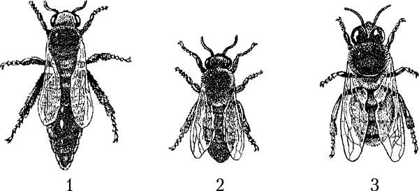 Рис. 1. Особи пчелиной семьи: 1 – матка; 2 – рабочая пчела;3 – трутень