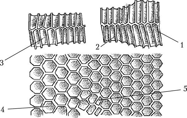 В пчелином гнезде соты расположены вертикально, параллельно друг другу. Каждый сот состоит из общего средостения, по обе стороны которого горизонтально располагаются ряды шестигранных ячеек (рис. 2).